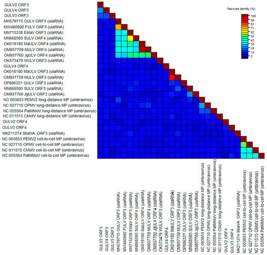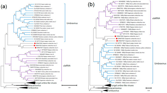 When studying the virome of ampelographic collections of Anapa and Dagestan in 2022, a novel grapevine umbra-like virus (GULV) from the family Tombusviridae was discovered [21,22]. This study confirms the presence of this virus in grapevines from the Don ampelographic collection. GULV was identified in 10 samples (Supplementary Table S7). By mapping reads to isolate OP886321, six whole-genome GULV sequences were obtained. A phylogenetic analysis showed that the isolates obtained in this study are similar to each other and to those detected earlier (Supplementary Figure S16).