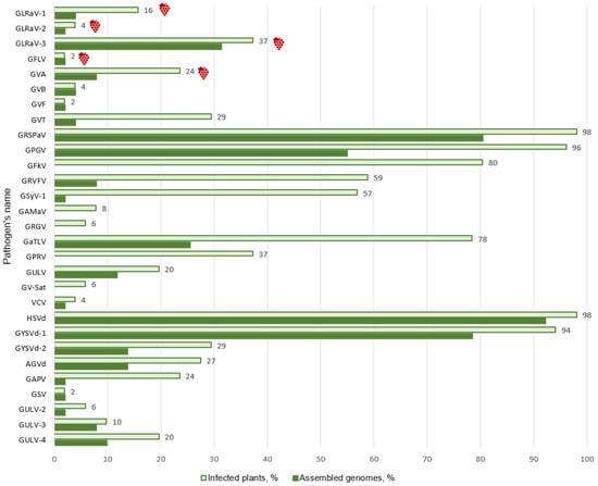 In the analysis of the viruses GLRaV-1, GLRaV-2, GLRaV-3, GRSPaV, GFLV, GPGV, GVA, GVB, and GVF with high coverage (more than a thousand reads per reference genome), a threshold of 10 reads and 15% of Ref Seq was set. For other viruses, no threshold was applied. Samples confirmed by both bioinformatics analysis of sequencing data and PCR were considered positive.