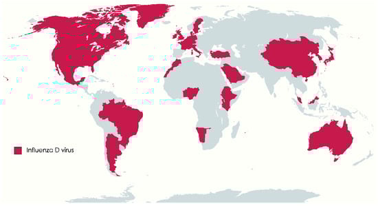 Influenza D virus (IDV) belongs to the Orthomyxoviridae family, the genus Deltainfluenzavirus, along with influenza viruses of the genera Alphainfluenzavirus (Influenzavirus A, IAV), Betainfluenzavirus (Influenzavirus B, IBV), and Gammainfluenzavirus (Influenzavirus C, ICV). Influenza viruses of distinct types (A, B, C, or D) exhibit variations in genome structure, properties of surface glycoproteins, and the antigenicity of the viral nucleoprotein and matrix protein [,]. Influenza viruses belonging to different types also display differing host ranges. Influenza A viruses exhibit broad host tropism, can infect wildfowl, swine, horses, bats, and humans, leading to severe respiratory disease and seasonal epidemics, and have the potential for triggering pandemics []. Based on the surface glycoproteins hemagglutinin and neuraminidase, IAV is divided into subtypes (H1 to H18 and N1 to N11). The main hosts for IBV and ICV are humans, IBV may cause seasonal epidemics, while ICV causes only mild illness. IBV has been isolated from seals and pigs [,]; antibodies against IBV were also reported in dogs and horses [,]. ICV can occasionally infect cattle [], dogs, and pigs [,]. Serological evidence of ICV was reported also in equine populations []. Influenza D virus is a relatively recent discovery, first identified in 2011 in pigs in the USA, although evidence indicates its circulation in cattle populations since at least 2003 [,]. IDV’s global distribution is now well-established, with reports from Europe, North America, South America, Africa, Asia, and recently Australia [,,,,,] (Figure 1).