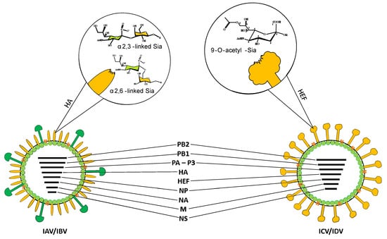 Schematic view of influenza virions. RNA segments are indicated. glycan binding preferences are presented at magnification. HA—hemagglutinin; HEF—hemagglutinin esterase fusion protein.