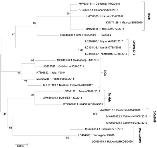 The first molecular detection of IDV in South America was in Brazil, with the samples being nasal swabs from a symptomatic cow. Further studies showed that the virus was phylogenetically divergent from known IDVs described in North America, Europe, and Asia []. Studies in Argentina indicated that, among 165 tested sera, 68% were positive for IDV antibodies []. In Australia, IDV RNA was detected in nasal and nasopharyngeal swabs in symptomatic and asymptomatic animals. Viruses circulating in Australia were grouped within the D/Yama 2016 and D/Yama2019 lineages [].