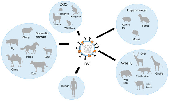 We have discussed the occurrence of IDV in various animal species and presented the findings of experimental studies. A schematic host range for IDV is shown in Figure 4.