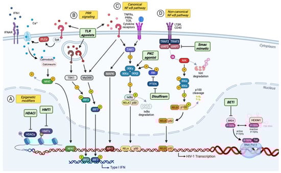 Cellular pathways targeted by LRAs. (A) Epigenetic modifiers: HDACi, which prevents histone deacetylation, and HMTi, which disrupts the deposition of repressive methylation marks, promote a relaxed chromatin structure, enhancing the accessibility of the viral promoter. BET proteins also impact the regulation of HIV-1 transcription. BRD4 competes with Tat for P-TEFb binding, thereby limiting Tat-mediated transcriptional activation. By displacing BRD4 from chromatin, BETi frees P-TEFb and enables its binding of Tat. (B) Pattern recognition receptor signaling: The stimulation of endosomal or cell surface TLRs leads to the activation of transcription factors NF-κB, AP-1, NFAT, and/or IRF family members. Since many TLRs are not expressed at significant levels in CD4+ T cells, TLR agonists identified as LRAs act mostly indirectly by inducing type I interferon production in plasmacytoid dendritic cells, which causes the downstream activation of CD4+ T cells and induces HIV-1 latency reversal. (C) Canonical NF-κB signaling: The recruitment of TAK1 by a range of transmembrane receptors, including TNFR, leads to activation of the IKK complex, the degradation of IκBα, and the translocation of the transcriptions factors RelA and p50 to the nucleus. This pathway can be activated by PKCa or by disulfiram to promote HIV-1 transcription. (D) Non-canonical NF-κB signaling is activated by a different set of receptors than the canonical pathway, including CD40 and LTβR. Non-canonical NF-κB signaling can be induced by Smac mimetics that antagonize cIAP proteins, leading to an accumulation of NIK, the cleavage of p100, and the translocation of the transcription factors RelB and p52 to the nucleus. Illustration created with BioRender.com.