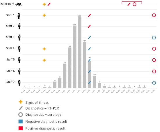 Timeline of events. Epidemic curve of mink mortalities * in grey, overlaid by onset of illness (crosses), sample collection, and diagnostic results (slashes and open circles) of the mink herd and seven staff present on a Michigan mink farm confirmed positive for SARS-CoV-2, 23 September–19 October 2020. Red bracket indicates dates of One Health field investigation, 13–16 October. * Mink mortality data were only collected until 17 October 2020.