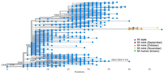 Study sequences were included in a phylogenetic analysis alongside SARS-CoV-2 sequences obtained from human specimens collected in Michigan and released on GISAID by 25 January 2021, where they had collection dates and were marked as high-quality sequences. Phylogeny was inferred using maximum likelihood analyses implemented in Treetime using the Nextstrain pipeline [30].