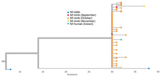 Closeup view of mink clade and associated sequences blue tree tips indicate Michigan human community samples taken March 2020 to January 2021, red, orange, and yellow are mink sequences from September, October, and November, respectively, and teal are outbreak-associated human sequences.