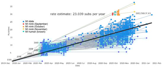 Phylogenetic analysis indicated viral evolution within the mink outbreak clade through time. Samples collected in September and October differed by 0–3 SNPs, while the two mink sequences collected in November differed by 2–8 SNPs relative to September. Furthermore, Nextstrain molecular clock estimation indicated a faster pace of evolution within the clade than in the broader Michigan community, with the clade rate estimate being 35.9 and the Michigan community estimate being 23.0 substitutions per year (Figure 4).