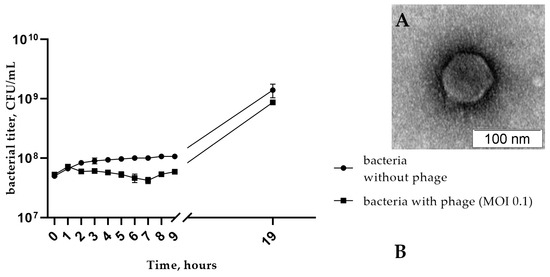 (A) Electron micrograph of StenR_269 phage particles negatively stained with 1% uranyl acetate; (B) the multistep bacterial reduction curve for S. rhizophila CEMTC 4565 in the life cycle of the phage StenR_269.