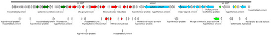 Genome DNA purification was carried out as described previously [25]. Briefly, DNase and RNase (Thermo Fisher Scientific, Waltham, MA, USA) were added to the phage suspension, each to a final concentration of 5 μg/mL, and the mixture was incubated at 37 °C for 30 min. Next, the phage suspension was supplemented with a 1/25 volume of 0.5 M EDTA (pH 8.0), 1/20 volume of 10% SDS solution, and proteinase K (Thermo Fisher Scientific, Waltham, MA, USA) to a final concentration of 100–200 μg/mL. Then, the suspension was incubated at 55 °C for 3 h and phage DNA was purified via phenol/chloroform extraction. Further, ethanol supplemented with a 1/30 volume of 3 M sodium acetate (pH 4.8) was added to precipitate the DNA. Covaris Ultrasonicator (Covaris, Moburn, MA, USA) was applied for phage DNA fragmentation. NEB Next Ultra II DNA Library Prep Kit for Illumina and NEB Next multiplex oligos for Illumina (both from New England BioLab, Ipswich, MA, USA) were used for DNA library construction. Sequencing was performed using MiSeq Benchtop Sequencer and the MiSeq v.2 reagent kit (2 × 250 base reads) (Illumina Inc., San Diego, CA, USA). Quality control of the obtained data and the removal of adapter sequences were performed using the Trimmomatic tool [26]. The phage genome was assembled de novo using SPAdes genome assembler v.3.15.2 [27] (http://cab.spbu.ru/software/spades, accessed on 2 July 2023). The sequencing coverage was estimated to be 405.
