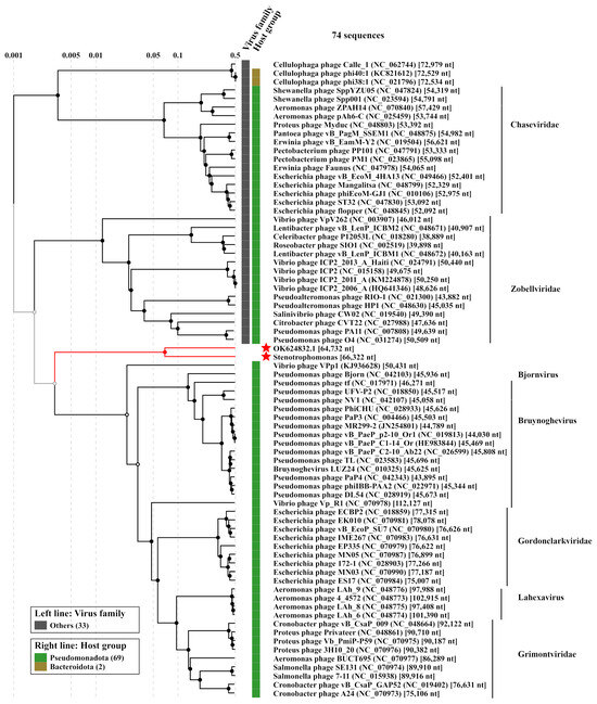 To date, 65 complete genomes of Stenotrophomonas phages are available in the GenBank database (https://www.ncbi.nlm.nih.gov/nucleotide, accessed on 10 November 2023) (Data S1). These include 60 phages that belong to the class Caudoviricetes (tailed phages with linear double-stranded DNA), and five phages that belong to the Inoviridae family (filamentous phages with circular single-stranded DNA). Stenotrophomonas caudate phages are diverse in genome content, life cycle and capsid morphotype [10,11,12,13,14,15,16,17]; 26 of them were distributed into six different families, namely Autographiviridae (n = 11), Mesyanzhinoviridae (n = 6), Schitoviridae (n = 5), Straboviridae (n = 2), Casjensviridae (n = 1) and Peduoviridae (n = 1). The remaining 34 tailed phages were assigned to the subfamily Beaumontvirinae (n = 6) and to the genera Menderavirus (n = 7), Delepquintavirus (n = 3) and Septimatrevirus (n = 2); the last 16 Stenotrophomonas bacteriophages are designated as unclassified representatives of the class Caudoviricetes (https://www.ncbi.nlm.nih.gov/nucleotide, accessed on 10 November 2023). In total, 22 phages have the podovirus morphotype; these include members of the families Autographivirinae and Schitoviridae, and four unclassified members of the class Caudoviricetes. According to GenBank data, 61 phages reproduce on Stenotrophomonas maltophilia as a host, and only 4 of them infect the Stenotrophomonas sp. (https://www.ncbi.nlm.nih.gov/nucleotide, accessed on 10 November 2023) (Supplementary Data S1). Phages specific to S. rhizophila have not been detected.
