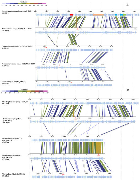To evaluate the taxonomy of the phage StenR_269, its genome was compared with available phage sequences from the NCBI GenBank database via a BLASTN search (accessed on 21 October 2023). A similarity of more than 90% was found with incomplete genomes of phage spp. isolates 227 (MN855844; sequence length: 9692 bp) and 386 (MN855896; sequence length: 6481 bp) (Supplementary Data S6). These sequences were found in the insect metagenome obtained from Apis mellifera [38]. No other phage sequences similar to that of the StenR_269 genome were found through the BLASTN search. The BLASTP and BLASTX search revealed a limited similarity of the StenR_269 proteins with those of the Xanthomonas phage DES1 (OK624832, unclassified Caudoviricetes), Citrobacter phage CVT22 (NC_027988, Zobellviridae), Vibrio phage VpV262 (NC_003907, Zobellviridae) and some unclassified phages. Then, ViPTree analysis was performed (Figure 3) and it was revealed that the phages StenR_269 and DES1 form a cluster that is genetically distant from other phages available in the Virus–Host database (https://www.genome.jp/virushostdb (accessed on 21 October 2023)). The VIRIDIC tool was used to estimate genome similarity and it was found to be very low (Data S7). Despite the low level of similarity between the StenR_269 and DES1 proteomes, ViPTree alignment revealed a clear similarity in the organization of the StenR_269 and DES1 genomes (Figure 4). Both genomes contained two clusters of genes that were grouped according to their function and orientation in the genome.