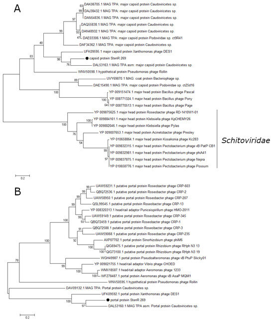 Phylogenetic analysis of structural proteins of the phage StenR_269. Capsid protein (A) and portal protein (B). Sequences were aligned using CLUSTALW, and the phylogenetic tree was constructed using the MEGA 7.0.21; maximum likelihood method with a bootstrap value of 1000 being applied.