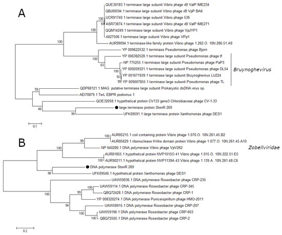 Phylogenetic analysis of the essential proteins of the phage StenR_269; terminase large subunit (A) and DNA polymerase (B). Sequences were aligned using CLUSTALW, and the phylogenetic tree was constructed using the MEGA 7.0.21; maximum likelihood method with a bootstrap value of 1000 being applied.