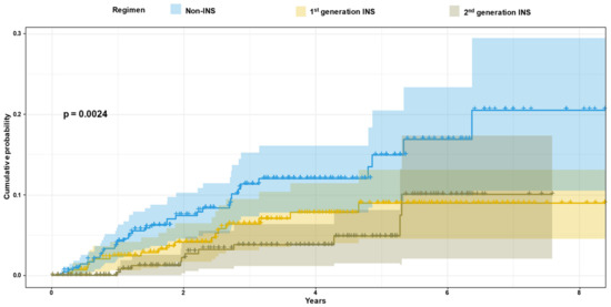 Cumulative probability of VF by treatment regimens. INSTI-integrase strand transfer inhibitors. The blue solid line shows the cumulative probability of VF, and blue shadowing shows the 95% CI (confidence interval) of the non-INSTI regimens. The yellow solid line shows the cumulative probability of VF, and yellow shadowing shows the 95% CI of the first-generation INSTI. The grey solid line shows the cumulative probability of VF, and grey shadowing shows the 95% CI of the second-generation INSTI.