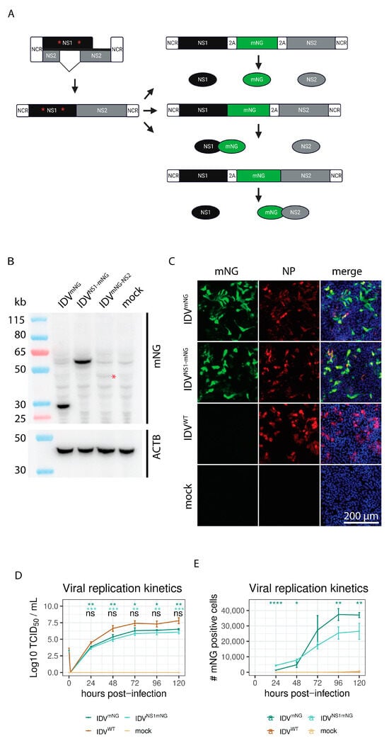 Rescue of recombinant influenza D reporter viruses. Schematic overview of the different reporter constructs generated, in which the mNeonGreen (mNG) gene (green) was inserted in between the coding sequences of NS1 (black) and NS2 (grey) and is flanked by one or two PTV-2A sequences (white). The synonymous point mutations to abrogate splicing of the NS1 gene are indicated with red asterixis. Created with BioRender.com (https://app.biorender.com/, accessed on 8 December 2023) (A). Western blot analysis using an mNG-directed antibody demonstrated the 2A autoproteolytic cleavage efficiency of the different reporter constructs. β-actin (ACTB) was used as a loading control. The red asterisk indicates the band corresponding to mNG-NS2 (B). Following virus rescue, HRT-18G cell cultures were infected with the different reporter viruses, using WT and mock-infected cultures as controls. At 72 hpi, cultures were formalin-fixed and processed for immunofluorescence analysis using an antibody against IDV (anti-NP, red) to visualize the overlap with mNG-expressing cells (green). The cell nuclei were counterstained with DAPI (blue). Scale bar is 200 µm (C). Corresponding viral replication kinetics were determined by monitoring progeny virus release every 24 h in the supernatant by virus titration (ns: not significant, *: p ≤ 0.05, **: p ≤ 0.01, ***: p ≤ 0.001, Tukey post-hoc test. Dark green: IDVmNG vs. IDVWT, light green: IDVNS1mNG vs. IDVWT, black: IDVmNG vs. IDVNS1mNG) (D) and quantifying the mNG-positive HRT-18G cells (E) over time (*: p ≤ 0.05, **: p ≤ 0.01, ****: p ≤ 0.0001, Tukey post-hoc test, IDVmNG vs. IDVNS1mNG).