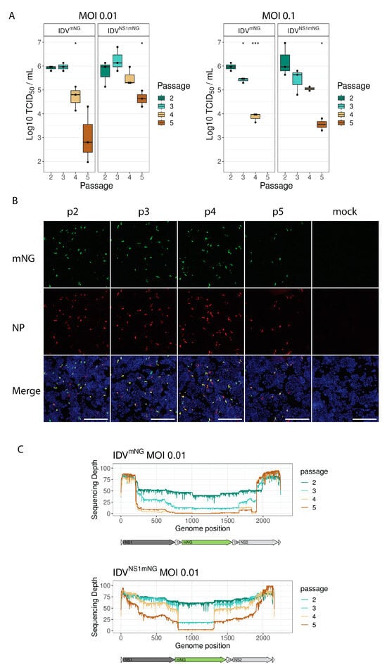 mNeonGreen expression is maintained for 3 passages in cell culture. Viral titers in the supernatant of HRT-18G cells infected with reporter IDVs after subsequent passages were determined at 144 hpi by assessing mNG fluorescence (*: p ≤ 0.05, ***: p ≤ 0.001, t-test against p2) (A). HRT-18G cells were infected with the passaged IDVmNG and immunostained using an antibody against IDV (anti-NP, red). mNeonGreen-expressing cells are shown in green. Nuclei are stained with DAPI (blue). Scale bar is 500 µm (B). The NS segments of the passaged reporter IDVs were PCR-amplified and fully sequenced. The sequencing coverage per nucleotide (y-axis) of the NS segments of IDV (x-axis) after subsequent passages at MOI 0.01 is displayed in colored lines, showing an accumulation of deletions at later passages (C).