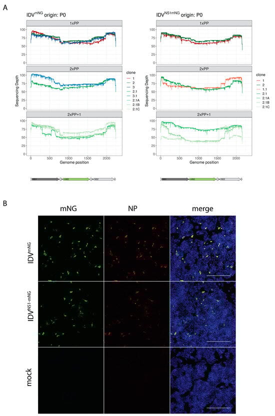 Plaque purification increases retention of the full-length reporter segment. The NS segment of the plaque-purified reporter IDVs was PCR amplified and fully sequenced. The sequencing coverage per nucleotide (y-axis) of the NS segments of IDV (x-axis) after subsequent plaque purification rounds and passages is displayed in colored lines, showing retention of the intact reporter segment over the passages. (1×PP: 1 round of plaque purification and subsequent expansion, 2×PP: 2 rounds of plaque purification and subsequent expansion, 2×PP+1: 2×PP with an additional passage at MOI 0.01). Viral descendants from plaque-purified clone 1 are depicted in shades of red, those descending from clone 2 in shades of green and from clone 3 in shades of blue. (A). HRT-18G cells were infected with the 2× plaque purified and passaged reporter viruses and immunostained using an antibody against IDV (anti-NP, red). mNeonGreen-expressing cells are shown in green. Nuclei are stained with DAPI (blue). Scale bar is 500 µm (B).