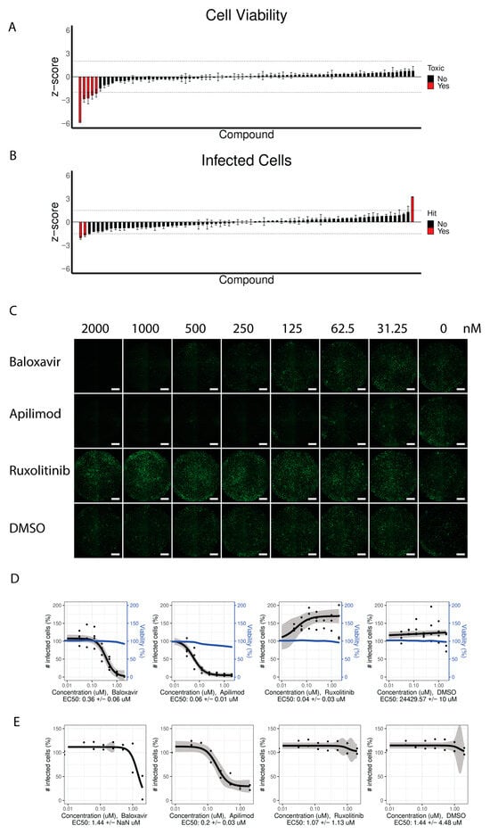 Because recombinant fluorescent reporter viruses are powerful tools for identifying novel antiviral compounds, we performed a proof-of-concept study using our IDVmNG fluorescent reporter virus from passage 2 to test a panel of 80 compounds from the COVID box (Table S2). Here we included Baloxavir Marboxil as a positive control, as it was previously shown to inhibit IDV replication [31]. Using a similar strategy, which we previously employed for SARS-CoV-2, we first evaluated cell viability after an incubation period of 73 h using the 80 compounds and the Baloxavir Marboxil at concentrations of 1 µM and the vehicle control (DMSO) on HRT-18G cells [33]. With this approach, we excluded five compounds from subsequent analysis because of cytotoxic effects on the HRT-18G cell line (Figure 4A). For the identification of potential IDV antagonists, HRT-18G cells were pretreated with the compounds for 1 h prior to infection with IDVmNG, during which 1 µM concentration for each compound was maintained. At 3 dpi, the number of mNG-positive cells was quantified to calculate the Z-score for each compound, and individual compounds with z-scores >1.5 or <−1.5 were considered hits (Figure 4B). Using this approach, we identified, next to our positive control Baloxavir Marboxil, a single compound inhibiting IDV replication, namely Apilimod, a PIKFyfe inhibitor [34]. Interestingly, we identified the JAK-inhibitor Ruxolitinib as a compound increasing IDV replication [35]. To determine the efficacy of the identified compounds, we treated HRT-18G cells with a serial dilution of the compounds of interest 1 h prior to adding the reporter virus. After 3 dpi, we counted the total number of mNG-positive cells under the different conditions and displayed the results using dose–response curves (Figure 4C,D). Baloxavir Marboxil and Apilimod displayed a dose-dependent effect with EC50 values of 0.36 µM and 0.06 µM, respectively, indicating that Apilimod is a more potent inhibitor of IDV replication than Baloxavir Marboxil. Intriguingly, Ruxolitinib showed increased mNG-positive cells at all concentrations, with an EC50 of 40 nM. This suggests that inhibiting the innate immune signaling can boost IDVmNG replication on HRT-18G cells at relatively low concentrations. To avoid IDVmNG-specific artifacts, we repeated the dose–response experiment with the parental IDVWT (Figure 4E). To detect virus-infected cells, we fixed the cells at the end of the incubation period and immunostained them for the NP protein. The results corroborated that Baloxavir Marboxil and Apilimod inhibit viral replication of IDVs, although the EC50 values were 3–4-fold higher (1.44 and 0.2 µM, respectively), suggesting that the reporter IDV is more susceptible to the inhibitors. Interestingly, we observed only a weak enhancing effect of Ruxolitinib on the viral replication of IDVWT, which suggests that this effect is specific to the reporter IDV.