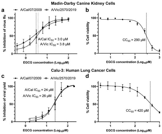 Using a cell-based drug susceptibility assay, we explored the efficacy of EGCG against two strains of influenza A(H1N1)pdm09 virus, A/California/07/2009 and the more contemporary A/Victoria/2570/2019, in Madin-Darby Canine Kidney (MDCK) and human lung carcinoma (Calu-3) cells. EGCG was active against both viruses, with a 50% inhibitory concentration (IC50) of 3.0 and 3.8 µM, respectively, in MDCK cells (Figure 1a) and 24 and 26 µM in Calu-3 cells (Figure 1c). This resulted in a selection index score (SI, 50% cytotoxic concentration (CC50)/IC50) of 96 µM for A/California/07/2009 and 77 µM for A/Victoria/2570/2019 in MDCK cells, given that the CC50 was 290 µM (Figure 1b). The CC50 in Calu-3 cells was 420 µM (Figure 1d), therefore the resulting SI was 18 and 16 for each virus, respectively, a 4 to 6-fold lower than the SI in MDCK cells.