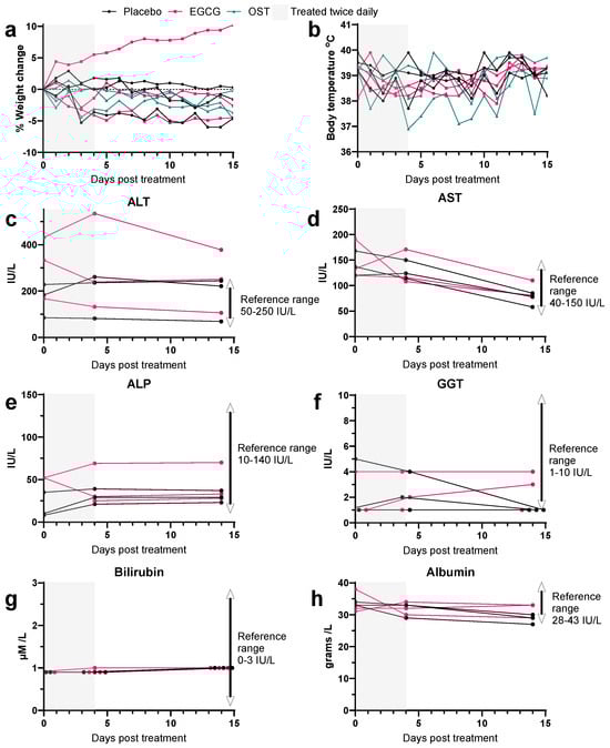 Weight loss, temperature, and liver enzyme/substrate analysis of uninfected ferrets treated with EGCG. Ferrets were treated with 1 mL/kg of sugar water (placebo) or 125 mg/kg EGCG per dose twice daily (8 h apart) for 5 days (d0–d4) or 5 mg/kg paediatric OST per dose twice daily (8 h apart) for 5 days (d0–d4). (a) The weight change of animals weighed daily is shown by solid lines. (b) Body temperature was recorded daily on a microchip, as shown by solid lines. For liver enzyme analysis, blood was harvested at d0, d4, and d14 post-treatment onset for biochemistry analysis of sera. Liver/biliary tract enzymes/substrates indicative of liver function, including (c) alanine transaminase (ALT), (d) aspartate transaminase (AST), (e) alkaline phosphatase (Alk Phos), (f) gamma-glutamyl transferase (GGT), (g) total bilirubin, and (h) albumin, were quantified with a reference range sourced from Hein et al. [41]. Three ferrets were used in each group.