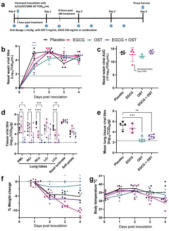 EGCG and Oseltamivir combination therapy in ferrets infected with A/California/07/2009 (a) Ferrets were treated with 1 mL/kg of sugar water (placebo), 250 mg/kg of EGCG, 5 mg/kg of paediatric oseltamivir (OST), or their combination twice daily (8 h apart) for 4 days, starting 1 h prior to intranasal inoculation with 5 log10TCID50/500 μL with A/California/07/2009. (b) Daily nasal wash samples were analysed by the TCID50 assay, with the mean titre indicated by the lines. The limit of detection (LOD) is indicated by the dashed line at 1.7 log10TCID50/mL. (c) The mean area under the curve (AUC) was determined from the shedding curves of individual ferrets over time. (d) At day four post-infection, respiratory tract tissues were collected for a virus titration assay. (e) The mean titre for all five major lung lobes shown for each animal. LOD is indicated by the dashed line at 2.3 log10TCID50/g. (f) Weight loss was determined daily relative to day 0 starting weight, with the mean percentage weight change indicated by the lines. (g) Body temperature was recorded daily from a subcutaneous microchip, with the mean temperature indicated by the lines. Data from four ferrets determined the mean and SD, compared across each group by Two-way ANOVA. Tukey’s multiple comparisons (* p < 0.05, ** p < 0.01, *** p < 0.001, **** p < 0.0001), or ordinary one-way ANOVA Tukey multiple comparisons for (b,d). Data representing the EGCG-treated group at day four are from only three ferrets due to mortality.