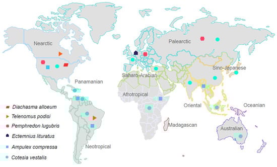 Map of the geographical distribution of the six selected parasitoid species. Each symbol represents a wasp species and refers to the large biogeographical regions instead of single countries. The zoogeographic realms and regions were divided and are represented according to Holt et al., 2013.