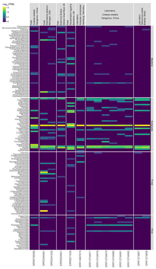 As expected, for each parasitoid species, there is a distinct pattern of virome since different viruses were detected. The differences are likely due to the species origin. Indeed, libraries of laboratory-reared C. vestalis differ in their viruses’ composition from field-collected wasp specimens. In the first case, six libraries had Cotesiavirus rhabdovi (2536–4679 TPM), and Cotesiavirus orthomyxi segments (1712–10,800 TPM) were the most abundant viral transcripts (Figure 9). On the other hand, we observed Cotesiavirus chinense exclusively in field-collected C. vestalis samples; Cotesiavirus virgavi was detected in samples derived from both origins.