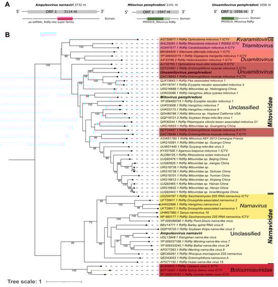Characterization of viral sequences related to elements from the Mitoviridae and Narnaviridae families. (A) ORF pattern and conserved domains of Ampulexvirus narnaviri (left panel), Mitovirus pemphredoni (middle panel), and Unuamitovirus pemphredoni (right panel). (B) Maximum likelihood tree of elements from the Mitoviridae and Narnaviridae families. The viral genomes assembled in our work are highlighted in bold. Bootstrap values under 60 are not shown.