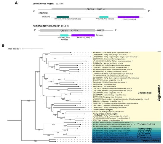 Characterization of viral sequences related to elements from the Virgaviridae family. (A) ORF pattern and conserved domains of Cotesiavirus virgavi (upper panel) and Pemphredonvirus anglici (lower panel). (B) Maximum likelihood tree of elements from the Virgaviridae family. The viral genomes assembled in our work are highlighted in bold. Bootstrap values under 60 are not shown.