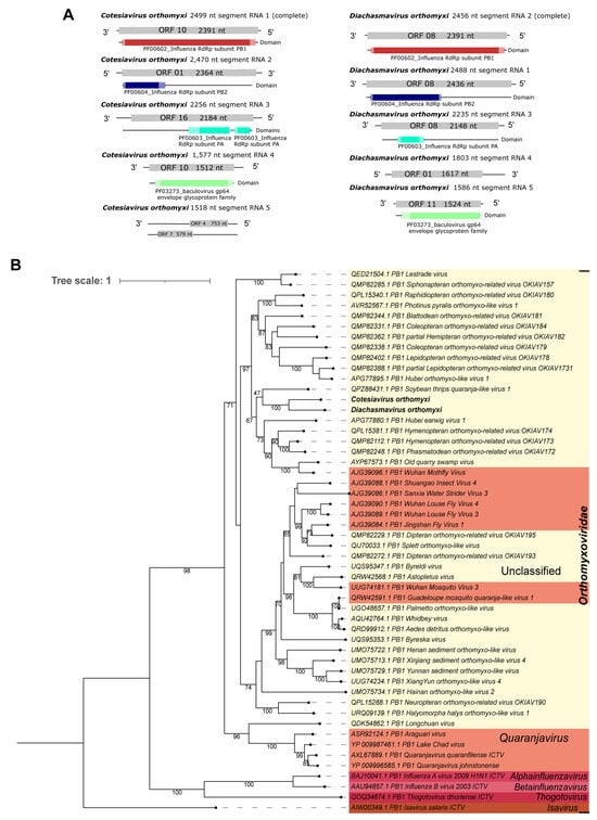 Characterization of viral sequences related to elements from the Orthomyxoviridae family. (A) Segments, ORF pattern, and conserved domains of Cotesiavirus orthomyxi (left panel) and Diachasmavirus orthomyxi (right panel). (B) Maximum likelihood tree of elements from the Orthomyxoviridae family. The viral genomes assembled in our work are highlighted in bold. Bootstrap values under 60 are not shown.
