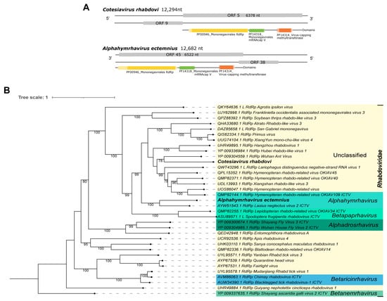 Characterization of viral sequences related to elements from the Rhabdoviridae family. (A) ORF pattern and conserved domains of Cotesiavirus rhabdovi (upper panel) and Alphahymrhavirus ectemnius (lower panel). (B) Maximum likelihood tree of elements from the Rhabdoviridae family. The viral genomes assembled in our work are highlighted in bold. Bootstrap values under 60 are not shown.