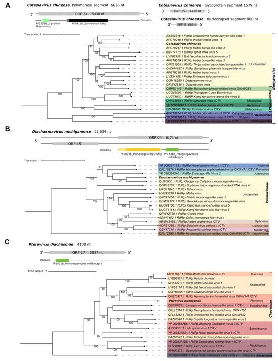 Characterization of viral sequences related to elements from the Bunyavirales, Xinmoviridae, and Chuviridae families. (A) Segments, ORF pattern, conserved domains, and maximum likelihood tree of Cotesiavirus chinense. (B) ORF pattern, conserved domains, and maximum likelihood tree of Diachasmavirus michiganense. (C) ORF pattern, conserved domain, and maximum likelihood tree of Pterovirus diachasmae. The viral genomes assembled in our work are highlighted in bold. Bootstrap values under 60 are not shown.