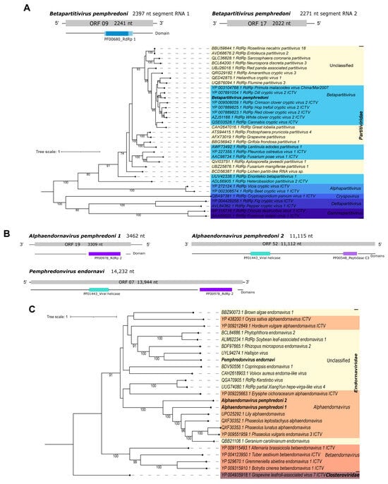 Characterization of viral sequences related to elements from the Partitiviridae and Endornaviridae families. (A) Segments, ORF pattern, conserved domain, and maximum likelihood tree of Betapartitivirus pemphredoni. (B) ORF pattern and conserved domains of Alphaendornavirus pemphredoni 1 (upper left panel), Alphaendornavirus pemphredoni 2 (upper right panel), and Pemphredonvirus endornavi (lower panel). (C) Maximum likelihood tree of elements from the Endornaviridae family. The viral genomes assembled in our work are highlighted in bold. Bootstrap values under 60 are not shown.