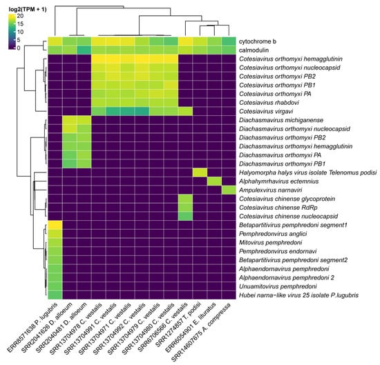 Assessment of the transcriptional activity of the viral segments indicated consistency in the abundance of segments from the same viral species, such as those identified in P. lugubris (Betapartitivirus pemphredoni), C. vestalis (Cotesiavirus orthomyxi), and D. alloeum (Diachasmavirus orthomyxi), which contained viruses with segmented genomes (Figure 9).