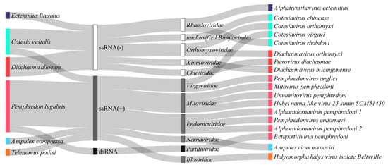 Viruses of the Bunyavirales order have been described in many hosts (such as arthropods, plants, and mammals), since this is the most abundant RNA virus order with eight families []. In this study, we found a member of this order, named Cotesiavirus chinense, which clustered with Wuhan insect virus 16.