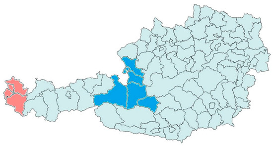 Map of Austria and its political districts. Colored districts correspond to those containing the 6 WWTPs monitored in Salzburg (blue) and the 5 WWTPs in Vorarlberg (red), covering in total 0.7 Mio inhabitants.