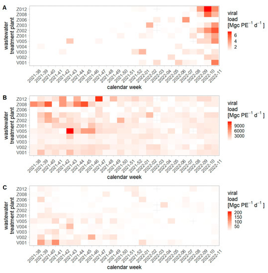 Viral load was defined as the concentration of gene copies detected multiplied by the daily wastewater flow rate. For comparison between WWTPs, viral loads were normalized to NH4-N load assuming a NH4-N excretion per person and day of 8 g N [37,38] resulting in mega (M), giga (G), or tera (T) gene copies per person per day (gcPE−1/d−1). To test for significant difference of reported NH4-N concentration between WWTPs, the Kruskal–Wallis rank sum test and the Wilcoxon rank sum as post hoc test with Bonferroni correction were performed.