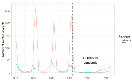 Seasonal occurrence of (red line) influenza virus and (blue line) norovirus infections in inpatients aggregated per month across Austria. The dashed black line marks the date of the first clinical COVID-19 case in Austria.