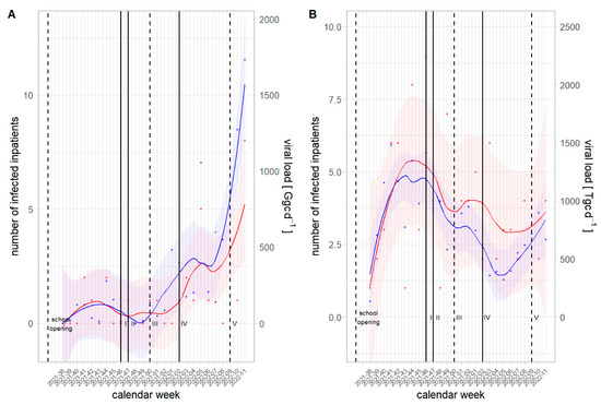 Comparison between viral loads in wastewater and number of infected inpatients from September 2021–March 2022 including time points for non-pharmaceutical intervention for IAV (A) and NoV GII (B). (Blue dots) Viral loads and (red dots) number of inpatients were aggregated at a weekly basis. Smoothing lines with 95% confidence bands correspond to LOWESS-smoothing. Six events increasing or decreasing the impact of NPIs on the spread of the COVID-19 pandemic were set from September 2021 to March 2022: September 9–school opens, (I) November 15—lockdown for those unvaccinated, (II) November 22nd—complete lockdown, (III) December 12—partial opening, (IV) January 11—Omicron measures, (V) March 5—complete opening.