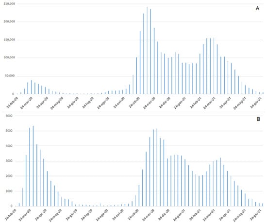 In the Italian epidemiological context (Figure 1A), the total number of new COVID-19 cases reported daily during the first wave was significantly less in comparison to the second wave (38,894 cases on 23 March, 2020; 242,062 cases on 9 November 2020), the total number of daily deaths (Figure 1B) was similar between the two waves (5339 deaths until 30 March 2020; 5151 deaths during the second wave until 30 November 2020) []. As reported by the Italian Integrated Surveillance System of Seasonal Influenza (InfluNET) [] these data are strictly different from those reported for seasonal influenza. During the 2017–18 season, the peak of influenza was reached in the second week of 2018 with a level of incidence equal to 14.74 cases per 1000 patients. Considering a total of 1,309,903 patients who received assistance for 2017–2018 seasonal influenza, 19,308 cases were estimated. This number is about half of those reported during the first wave of COVID-19, and about 1% of the total new COVID-19 cases reported daily during the second wave [].