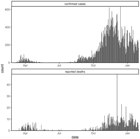 Daily Sardinian COVID-19 confirmed cases and reported deaths.