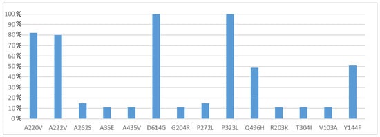 Whole genome sequence analysis of Sardinian samples showed a significant variability among viruses circulating in this area, most probably as a result of multiple introductions of different lineages at the beginning of the second wave. Overall, we reported 108 different mutations in different protein coding regions. Two missense mutations (P323L in the Nsp12 and D614G in the Spike) were shared by all viral genomes. Further mutations appeared to be A222V in the Spike and A220V in the N protein, found in 80% of the sequences, and Q496H in the NSP2 and Y144F in the Spike, shared by about 50% of the sequences. Other mutations were also present at different levels of frequency among the sequences analyzed (Tables S3 and S4), Spike being the protein that showed the highest variability.