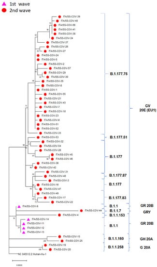 All the samples collected during the first wave belong to the clade GR and to the B.1.1 lineage, while during the second wave, the dominant circulating clade in Sardinia was GV, with B.1.177.75 as the dominant lineage.