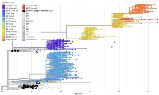 All newly generated sequences, along with already-published Sardinian sequences, were placed on the full phylogenetic tree of GISAID, GenBank, COG-UK and CNCB SARS-CoV-2 sequences using Usher [] and run in the UCSC genome browser [] on 7 November 2022. Individual subtrees containing 500 sequences each were extracted and visualized using Auspice [] and NextStrain [].