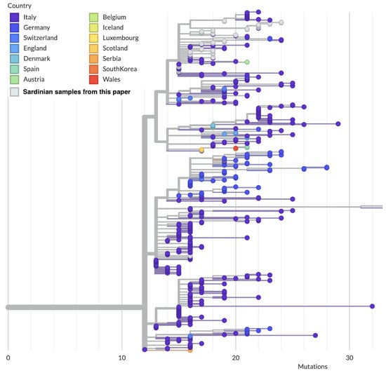 The full SARS-CoV-2 tree obtained from all GISAID sequences using Usher [] and Nextstrain [] evidenced that the 55 Sardinian SARS-CoV-2 samples are grouped into 18 different disconnected subtrees (Figure 5 and Table S4).