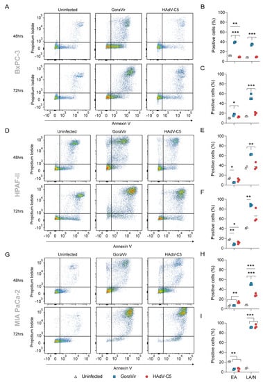 Oncolytic viruses are characterized by their capacity to induce a lytic form of cell death, which aids in their subsequent ability to induce adaptive antiviral and anti-tumor immune responses. Conversely, these antiviral responses provide these vectors with a limited therapeutic window [17]. For that reason, an oncolytic vector that progresses to the initiation of cell death quickly after infection could increase the therapeutic efficacy. To characterize the time course of GoraVir-mediated cell killing, three human pancreatic cancer cell lines (BxPC-3, HPAF-II and MIA PaCa-2) were exposed to GoraVir, or as a reference control HAdV-C5, at MOI 10. Virus-induced cell death was monitored at 24, 48, and 72 hpi by flow cytometry using propidium iodide (PI)/Annexin V staining. Annexin V + PI− cells were considered early apoptotic (EA) cells, while Annexin V-PI+ and Annexin V + PI+ cells were considered late apoptotic/necrotic (LA/N) cells. In all cell lines, no induction of cell death was observed for both viruses in comparison to uninfected cells at 24 hpi. At 48 hpi, infection with GoraVir induced significantly higher percentages of LA/N cells than HAdV-C5 in BxPC-3 (Figure 1A,B), HPAF-II (Figure 1D,E), and MIA PaCa-2 cells (Figure 1G,H). For the BxPC-3 cells, these differences were further increased at 72 h, where most cells had shifted to a LA/N type of cell death (52.71 ± 3.43%, Figure 1C). In contrast, HAdV-C5 did not show any increase in EA or LA/N BxPC-3 cells when compared to uninfected cells by 72 hpi.