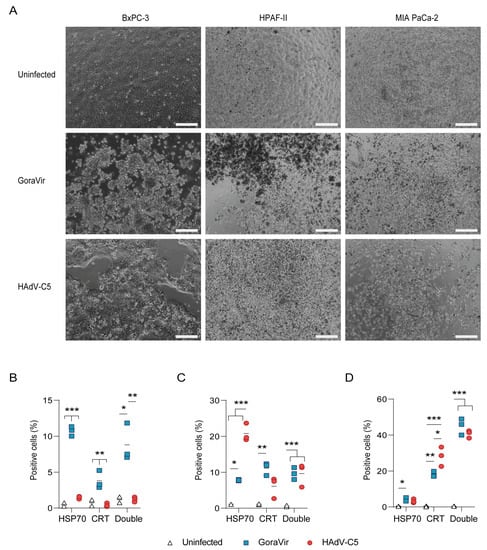 Protein expression of immunogenic cell death (ICD) markers in pancreatic cancer cell lines upon infection with GoraVir and HAdV-C5. (A) Light microscopy images of pancreatic cancer cells infected with GoraVir or HAdV-C5 at 72 hpi. Scale bar represents 500 µm; (B) BxPC-3, (C) HPAF-II, and (D) MIA PaCa-2 cells were infected with GoraVir or HAdV-C5 at MOI 10 and 72 hpi. The percentage of calreticulin (CTR)-positive, HSP70-positive, or double-positive cells was determined by flow cytometry. Means are depicted of n = 3 biologically independent replicates. Means were compared using one-way ANOVA with Tukey correction for multiple testing. Significant differences are indicated by asterisks, with p values < 0.05 shown as *, <0.01 shown as **, and <0.001 shown as ***.