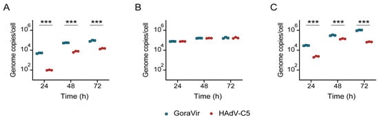 The induction of cell death following virus infection has the ability to either limit viral replication or promote viral dissemination. This delicate balance is especially important in the context of oncolytic virotherapy, where these temporal dynamics may influence therapeutic efficacy. In A549 cells, GoraVir has been shown to replicate faster and kill at an earlier onset than HAdV-C5 [14]. Since GoraVir demonstrated earlier onset of cell killing in the pancreatic cancer cell lines, we sought to establish whether this was also accompanied by faster replication kinetics. Therefore, all three cell lines were infected with GoraVir or HAdV-C5 and viral replication was assessed at 24, 48, and 72 h. In BxPC-3 cells, GoraVir replicated significantly better than HAdV-C5 with ~2-log difference in viral genome copies at 24 hpi and ~1-log difference at later time points (Figure 3A). It seems plausible that HAdV-C5′s restrained ability to replicate in these cells underlies its inability to kill these cells within a short time frame (Figure 1C). In HPAF-II cells, infection with both viruses yielded high viral genome copies within the first 24 h of infection which only increased marginally in the following days (Figure 3B). No differences were observed between the viruses. Infection of MIA PaCa-2 cells was comparable to the kinetics observed in BxPC-3 where GoraVir replicates significantly better compared to HAdV-C5 at all time points (Figure 3C). However, the differences between the two viruses were smaller.