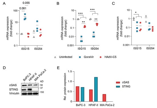 ISG response upon infection with GoraVir or HAdV-C5 through cGAS/STING signaling. (A) BxPC-3, (B) HPAF-II, and (C) MIA PaCa-2 cells were infected with GoraVir or HAdV-C5 at MOI 10 and mRNA expression of ISG15 and ISG54 was measured at 24 h post infection. Fold change expression was calculated relative to GAPDH. Means are depicted of n = 3 biologically independent replicates; (D) Protein expression of cGAS, STING, and Vinculin in pancreatic cancer cells.; (E) Quantification of cGAS and STING protein levels normalized to Vinculin. Means were compared using multiple unpaired t tests and the Holm-Šídák correction. Significant differences are indicated by asterisks, with p values < 0.05 shown as *, <0.01 shown as **, and <0.001 shown as ***.