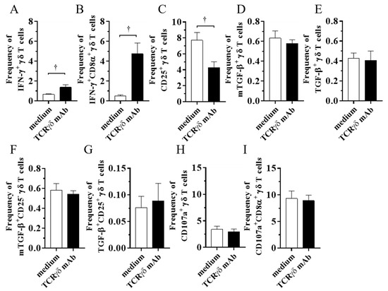 Cytokine and CD107a profiles in γδ T cells at 4 or 18 h post-stimulation with anti-TCRγδ antibody. The PBMCs obtained from healthy SPF chickens were stimulated with or without anti-TCRγδ antibody, and degranulation activity of γδ T cells (4 h post-stimulation (hps)) and cytokine production (18 hps) were analyzed using flow cytometry. Percentages of IFN-γ+ γδ T cells within γδ T cell populations (A), IFN-γ+CD8α+ γδ T cells within CD8α+ γδ T cell populations (B), CD25+ γδ T cells within γδ T cell populations (C), mTGF-β γδ T cells within γδ T cell populations (D), TGF-β γδ T cells within γδ T cell populations (E), mTGF-β+CD25- γδ T cells within γδ T cell populations (F), TGF-β+CD25+ γδ T cells within γδ T cell populations (G), CD107a+ γδ T cells within γδ T cell populations (H), and CD107a+CD8α+ γδ T cells within CD8α+ γδ T cell populations (I) derived from the PBMCs are shown. TCRγδ-unstimulated cells were used as a negative control. Data represent the mean of 6 biological replicates ± SE. Significant differences are indicated by †: p < 0.05.